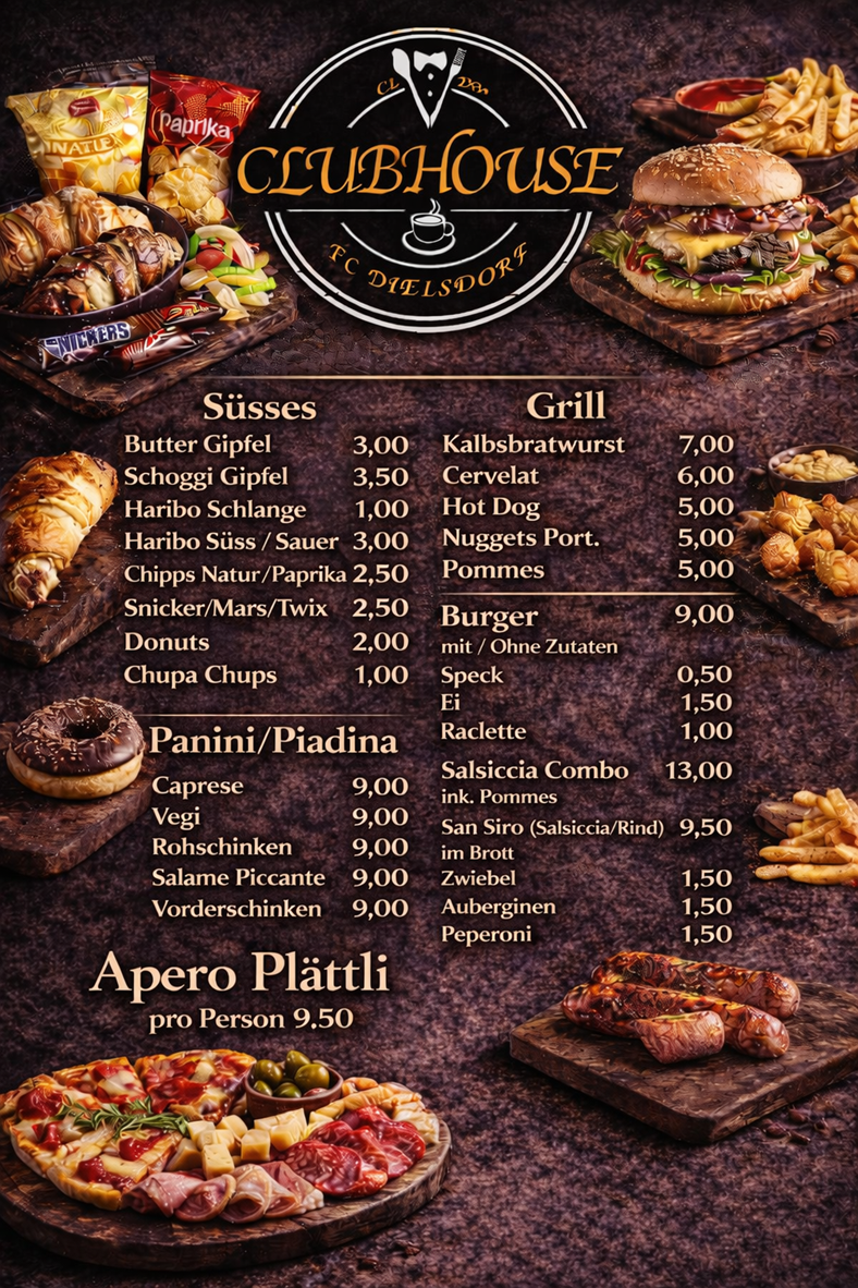 Willkommen auf der Menüseite des CLAN Clubhouse! Hier präsentieren wir Ihnen unsere köstlichen Angebote an heissen Pannini, leckeren Hamburgern und erfrischenden Getränken. Lassen Sie sich von unserer vielfältigen Auswahl verführen und genießen Sie eine kulinarische Reise in unserem gemütlichen Clubhaus in Dielsdorf.